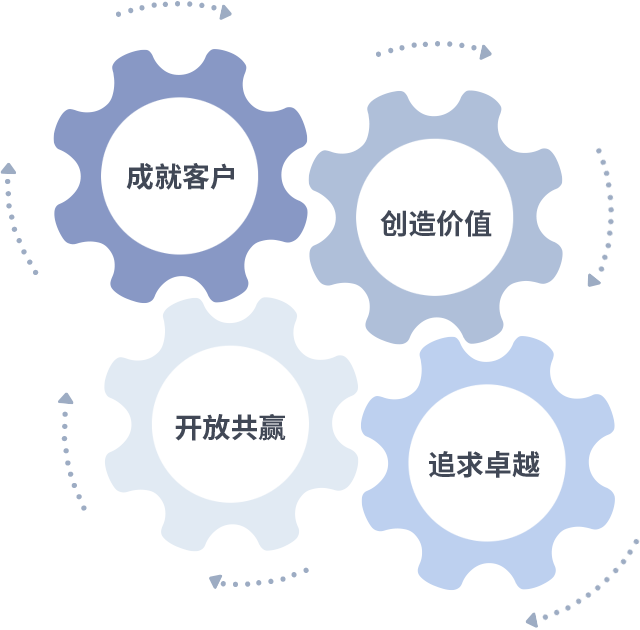 成就客户是一切决策的出发点,创造价值是衡量所有工作的标准,追求卓越是美狮贵宾会官网做事做人的态度,开放共赢是美狮贵宾会官网的格局也是最终的结果。价值观的齿轮环环相扣,推动着组织里的每个人不断向前。